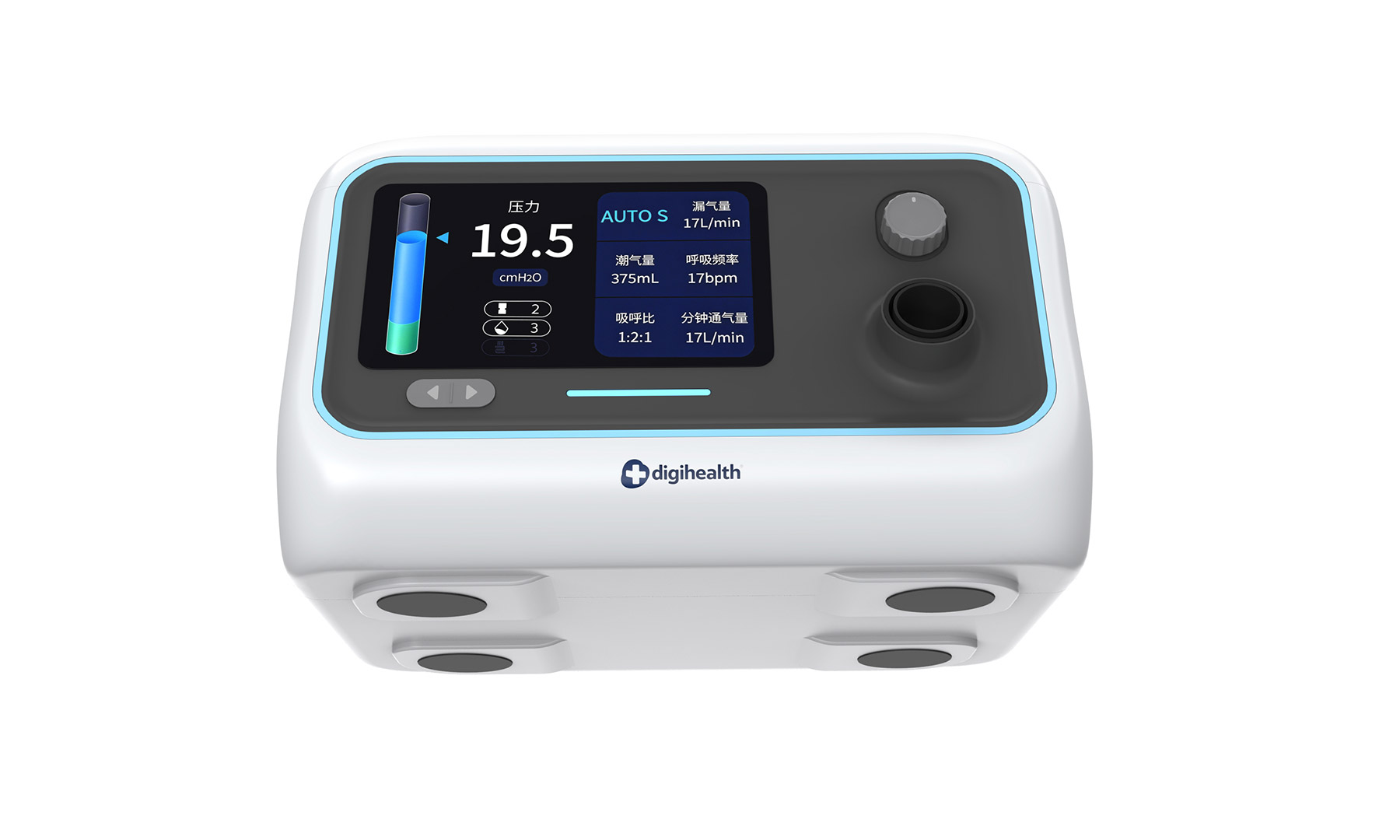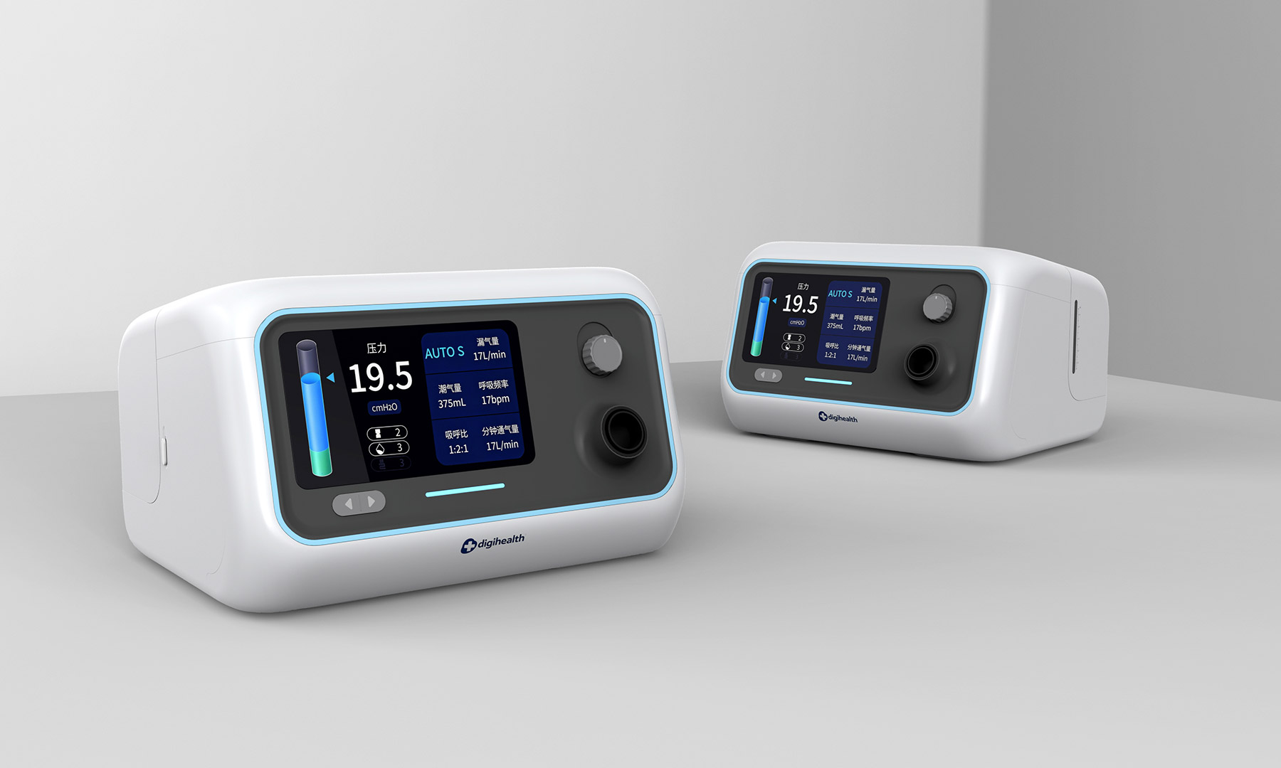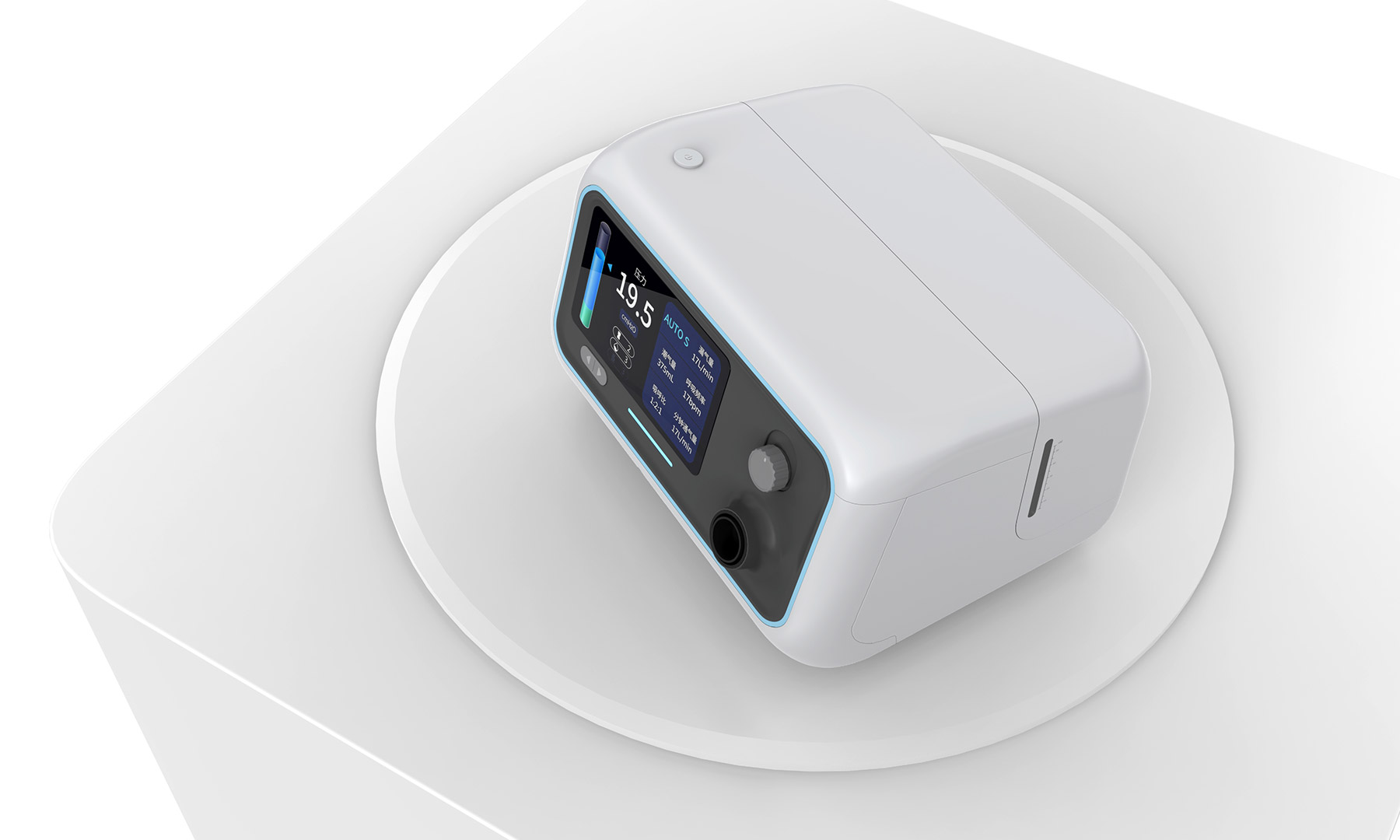 以 “柔和包裹感” 为核心视觉语言,整机采用圆润流线型曲面设计,弱化医疗产品的生硬感,用亲和的形态消弭用户使用时的心理距离。操作上兼顾便捷与精准:触控屏直观呈现压力、通气量等治疗数据,搭配实体旋钮实现参数的细腻调节,双操作模式适配不同使用习惯。