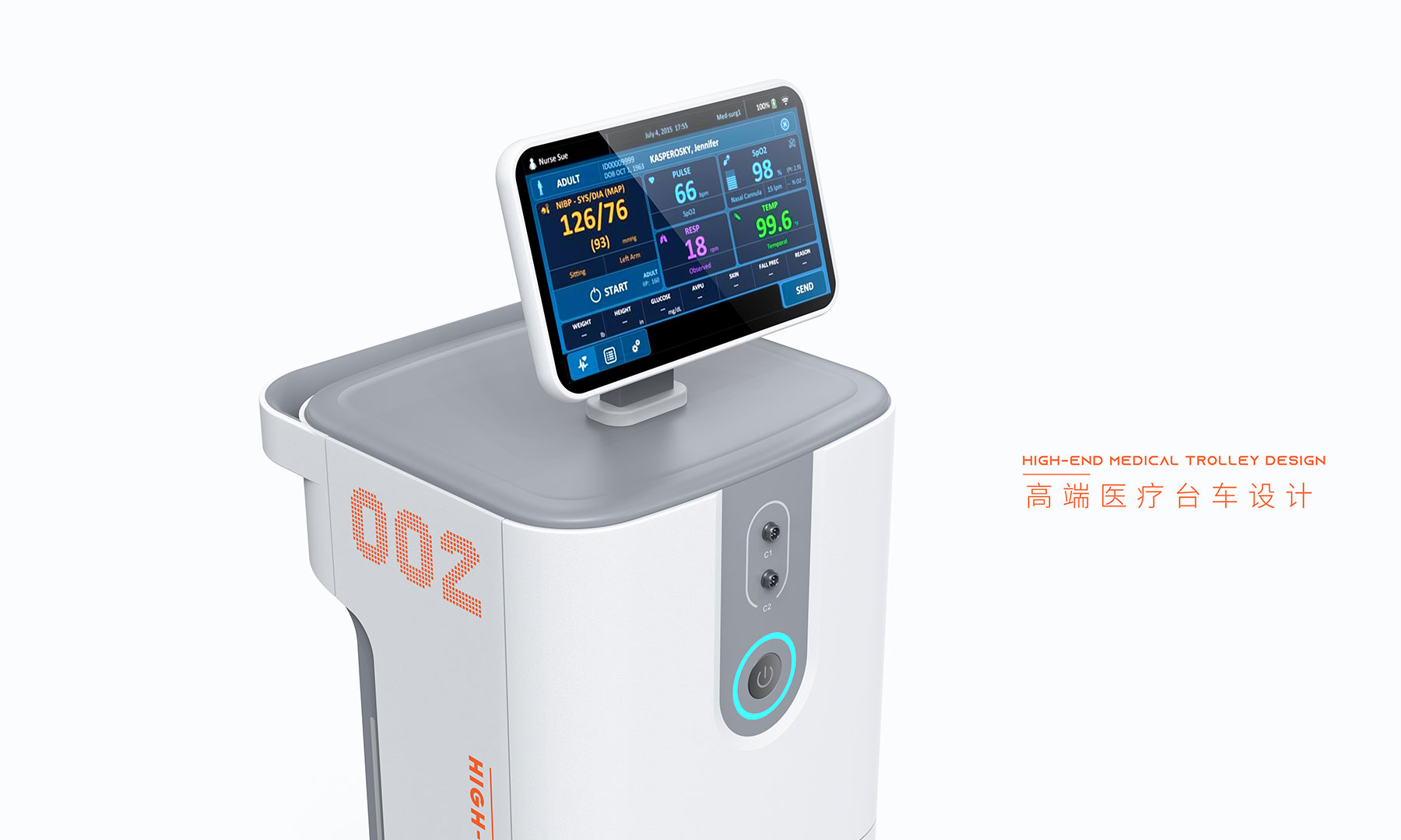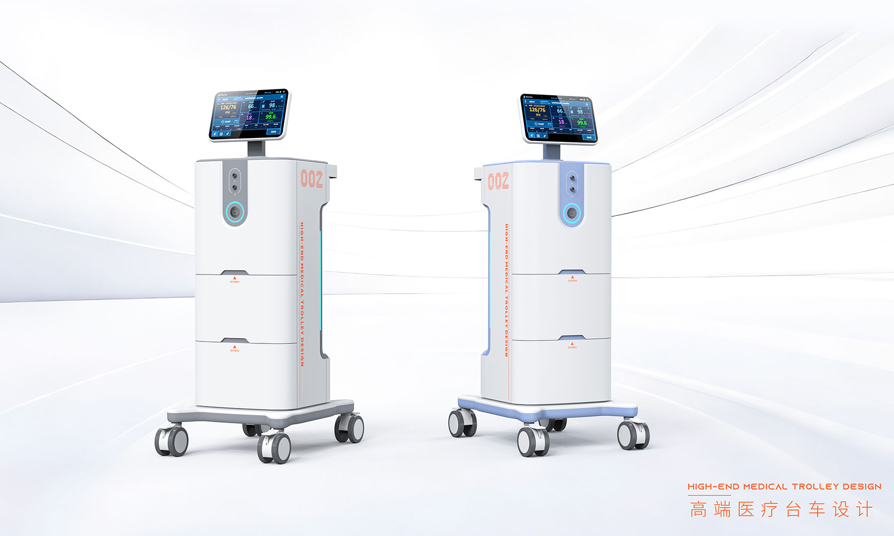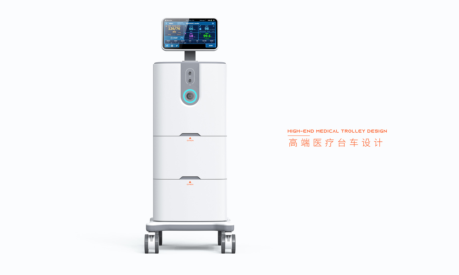 功能结构上,推车巧妙地分为三层,每层都有其独特的功能。上层是一个治疗控制区,在前面设计有跑道圆设计元素,增强产品视觉看点,治疗接口朝前,便于医疗设备插拔使用,正面呼吸灯与侧面呼吸灯元素相呼应,增强产品的科技属性,为用户在治疗时可实时检测治疗状态。中间层是两个矩形的存储区域,可以分类存放各种医疗用品,方便医护人员快速取用。下层则是一个开放式的平台,提供了更大的储物空间,适合存放大型或不规则的物品。