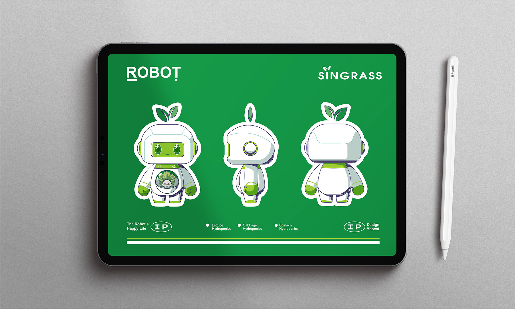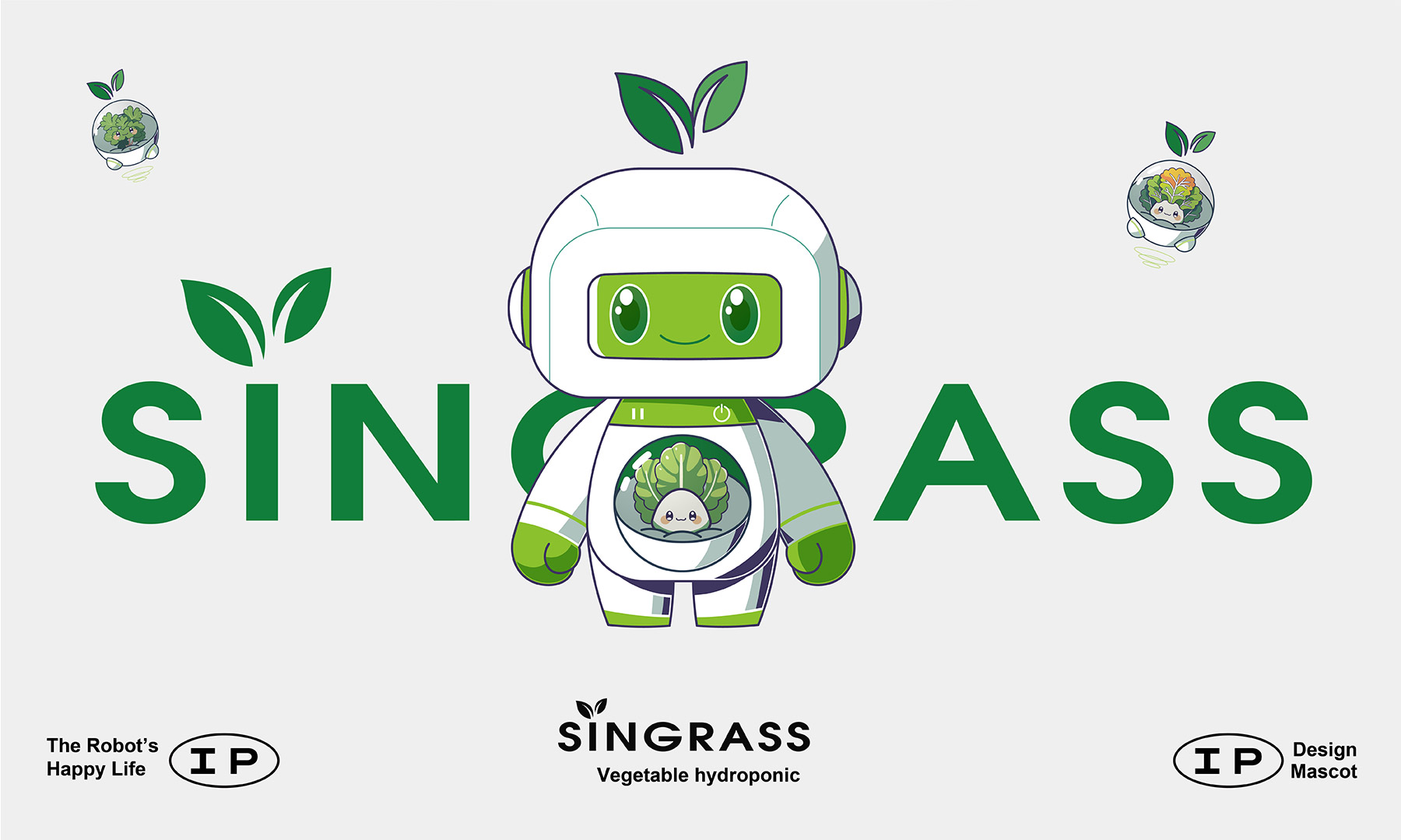 这是为Singrass室内智能生态系统设计的IP形象。依托自然生态与科技融合的理念,确立绿色为主色基调,象征生机勃勃的蔬菜水培系统,构成清新明快的生态色阶;辅助色系以白色构建科技亮点,结合透明材质与光影,营造和谐的室内智能生态系统。