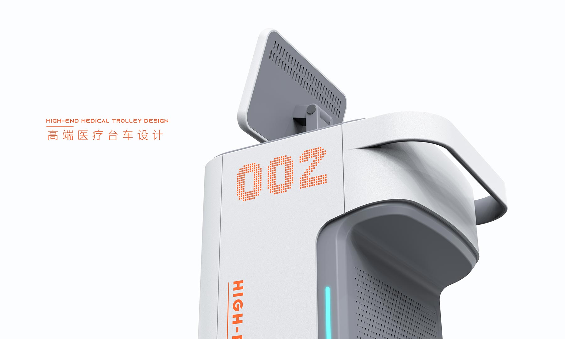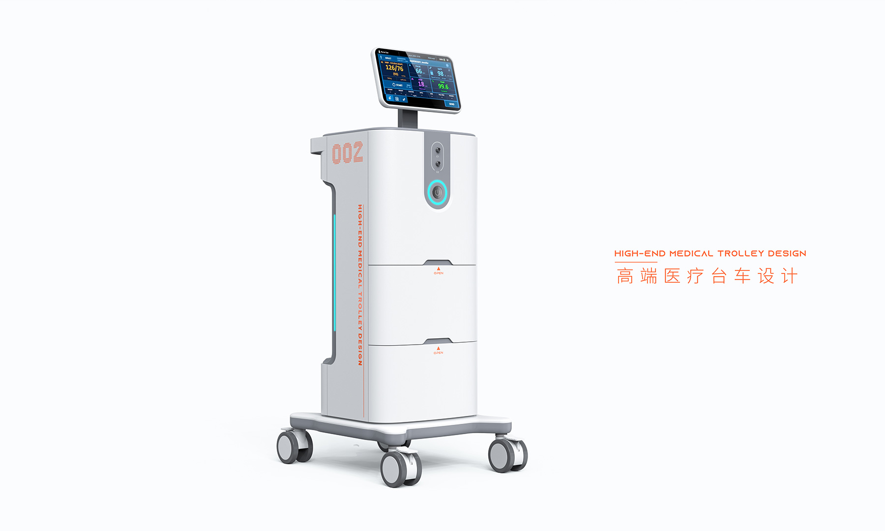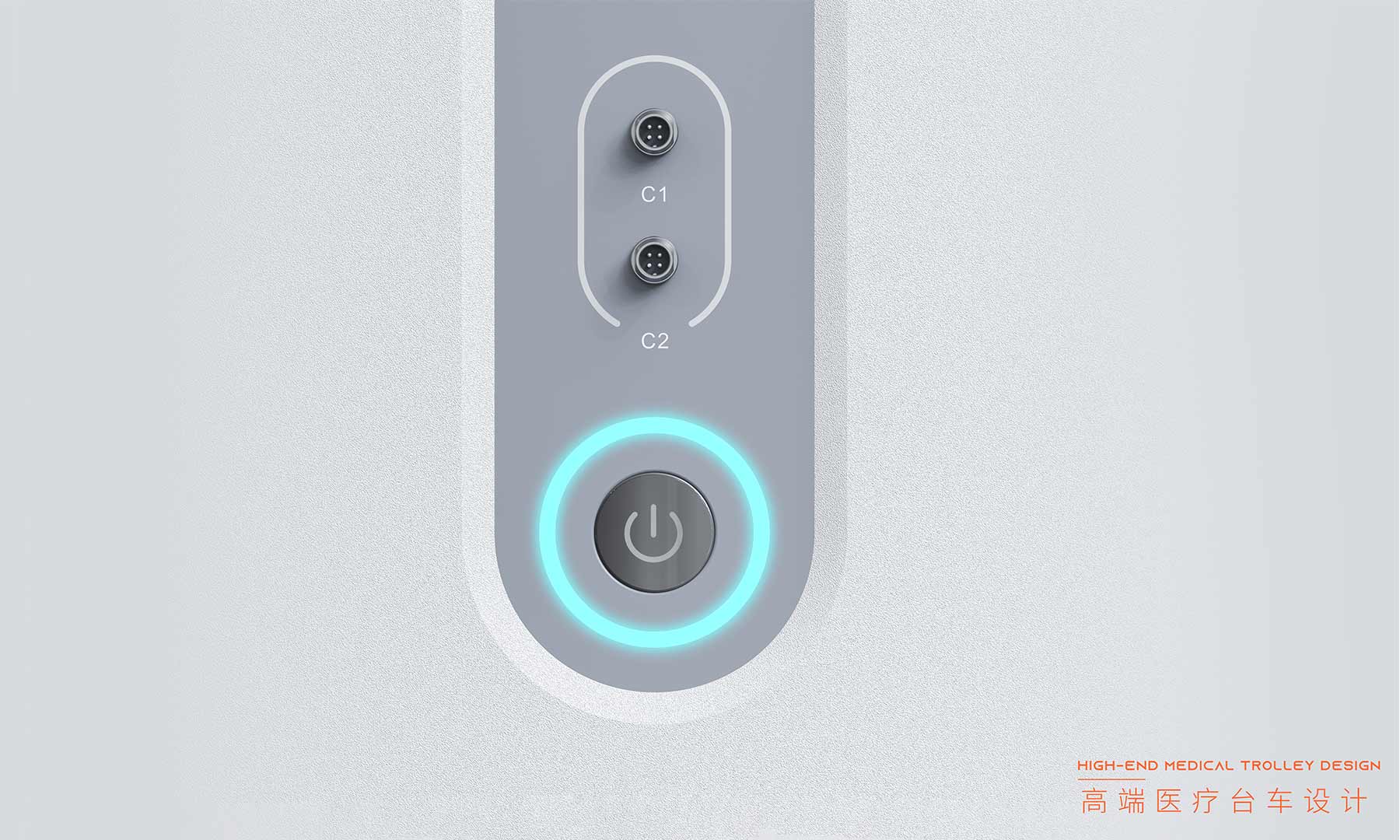功能结构上,推车巧妙地分为三层,每层都有其独特的功能。上层是一个治疗控制区,在前面设计有跑道圆设计元素,增强产品视觉看点,治疗接口朝前,便于医疗设备插拔使用,正面呼吸灯与侧面呼吸灯元素相呼应,增强产品的科技属性,为用户在治疗时可实时检测治疗状态。中间层是两个矩形的存储区域,可以分类存放各种医疗用品,方便医护人员快速取用。下层则是一个开放式的平台,提供了更大的储物空间,适合存放大型或不规则的物品。