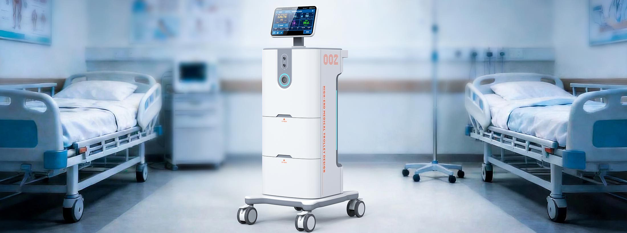 这款医疗手推车的设计充分展现了现代医疗设备的简洁与功能性。其外观采用白色和浅灰色的配色,不仅沉稳内敛,还符合医疗环境的洁净要求,同时展现出一种现代、专业的气质。
