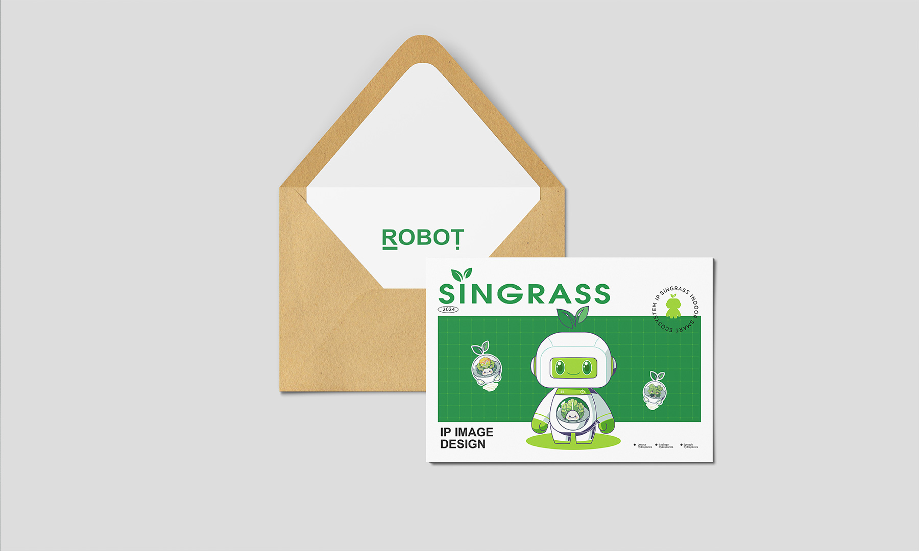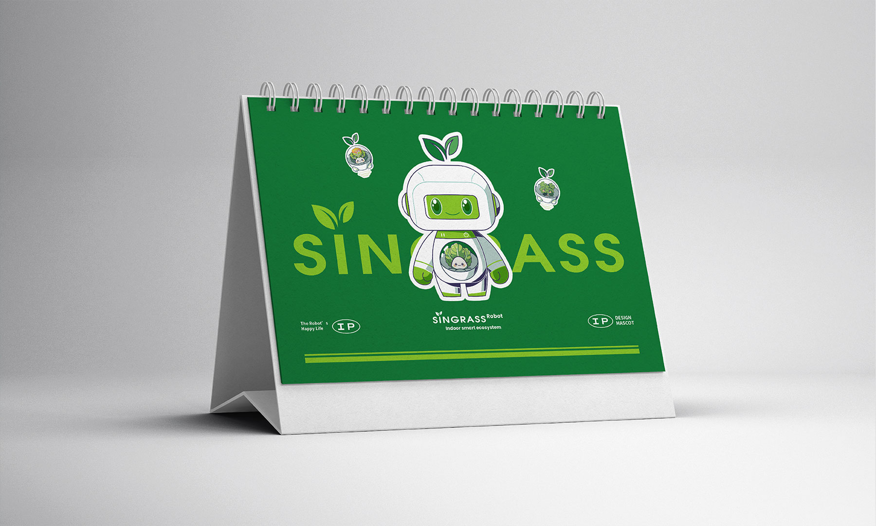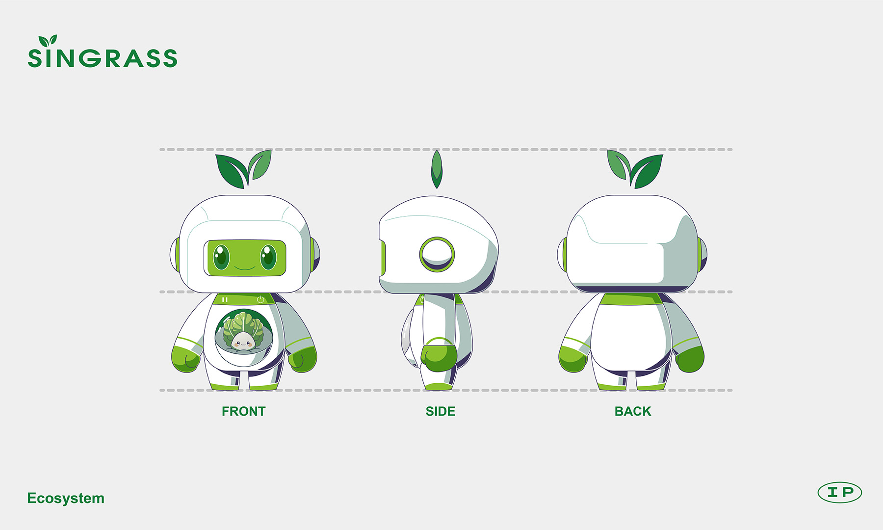 这是为Singrass室内智能生态系统设计的IP形象。依托自然生态与科技融合的理念,确立绿色为主色基调,象征生机勃勃的蔬菜水培系统,构成清新明快的生态色阶;辅助色系以白色构建科技亮点,结合透明材质与光影,营造和谐的室内智能生态系统。